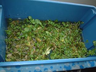 クレソン。これも職場で売れ残ったクレソンを水を張ったプランターに入れただけ・・・。収穫は下部を5センチほど残した上のみを収穫して放っておくとまた育ちます。最近水だけでは葉の育ちが悪いので、薄い砂糖水を試してみます。(できれば化学肥料を使いたくないので)