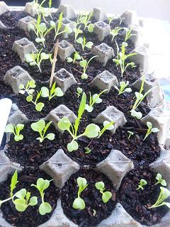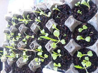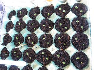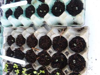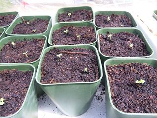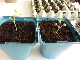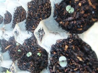 セージ(SAGE)です。今年買った種から4粒だけ種をまいたのですが、2つしか芽が出ませんでした。種が悪いのか、何か方法が悪いのか分かりません。本葉が生えたところで、小さな鉢に植え替えました。この鉢一杯に根が張るまで室内の観賞用として育てようと思います。大きくなったら庭に直接植える予定です。この日あわせてさらに3粒種をまきました。でも2つで十分だったかもしれません。