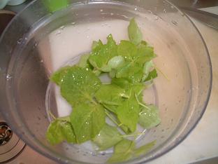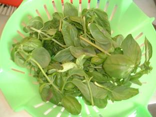 大きな葉のみを回収すれば直径25センチのボールにこれくらい・・・。ちょうどの量です。10日ほどで小さい葉も大きくなり新芽も出てきます。そうすれば大きい葉のみまた回収・・・。